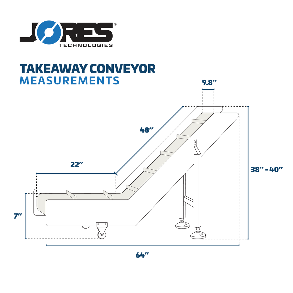 Integrating the Jores Technologies Motorized Take Away Incline Conveyor into your packaging process instantly streamlines and modernizes the transition between bagging and downstream quality control, packaging, or accumulation. As an irreplaceable link in automated systems, it minimizes labor, reduces risk of product jams or damage, and improves the speed and reliability of your vertical and overhead conveyor line. Upgrade your operation and meet demanding schedules with confidence.