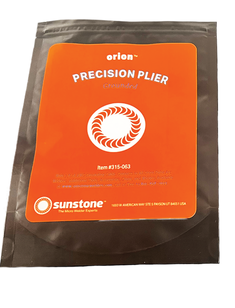 For improved handling of fine chain! Orion Precision Plier with banana connector and 3' Lead with 18 AWG cables for your Orion permanent jewelry welder. Used for grounding fine chain.