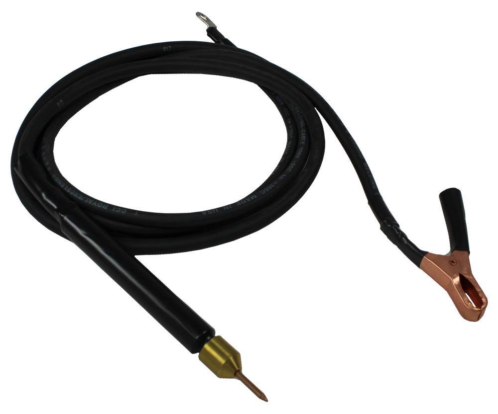 Ideal for Single Side welding and includes grounding clip to ground piece that you are welding. After grounding clip is attached the single probe is placed on the part and adequate pressure is applied by the user's hand. The weld is then actuated from another source such as a foot pedal. This completes the weld.
